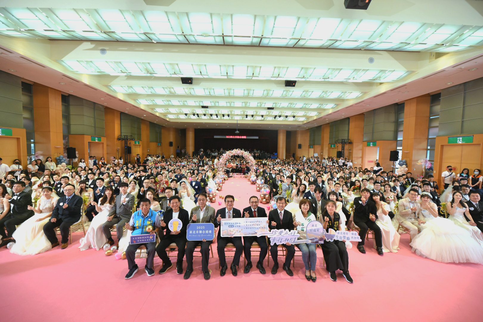 2025新北市聯合婚禮(19)日於新北市政府浪漫登場,102對新人在市長侯友宜、副市長劉和然的見證下,互許終身、交換誓言,齊聲喊出「我願意!」,現場洋溢著滿滿幸福與祝福,溫馨氣氛瀰漫整個會場。