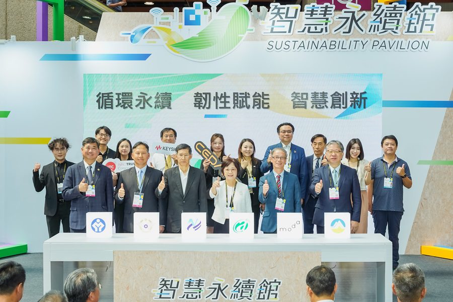▲(由左至右)勞動部勞動及職業安全衛生研究所王厚誠所長、國防部軍備局獲得管理處李鵬霄處長、國發會產業發展處蕭振榮處長、農業部農業科技司李紅曦司長、數位發展部數位產業署林俊秀署長、環境部資源循環署許智倫副署長、共同於智慧永續館啟動儀式合影。(圖/數位發展部數位產業署提供)