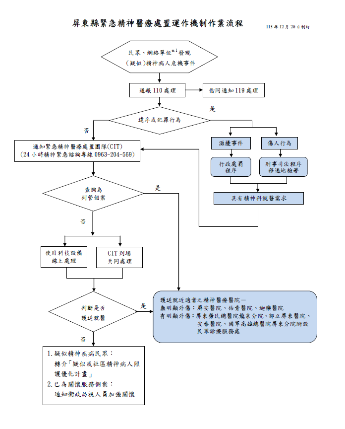 屏東縣政府衛生局表示, 114年委託迦樂醫院承接精神醫療緊急處置及提供24小時緊急諮詢服務,建立社區精神安全相關機制,讓第一線的警、消人員可以在第一時間獲得必要協助,民眾如在社區中發現或遇到疑似精神病人出現自我傷害或傷害他人的行為,可先撥打110或119通報,或本縣24小時精神緊急諮詢專線0963204569執行評估及處理。