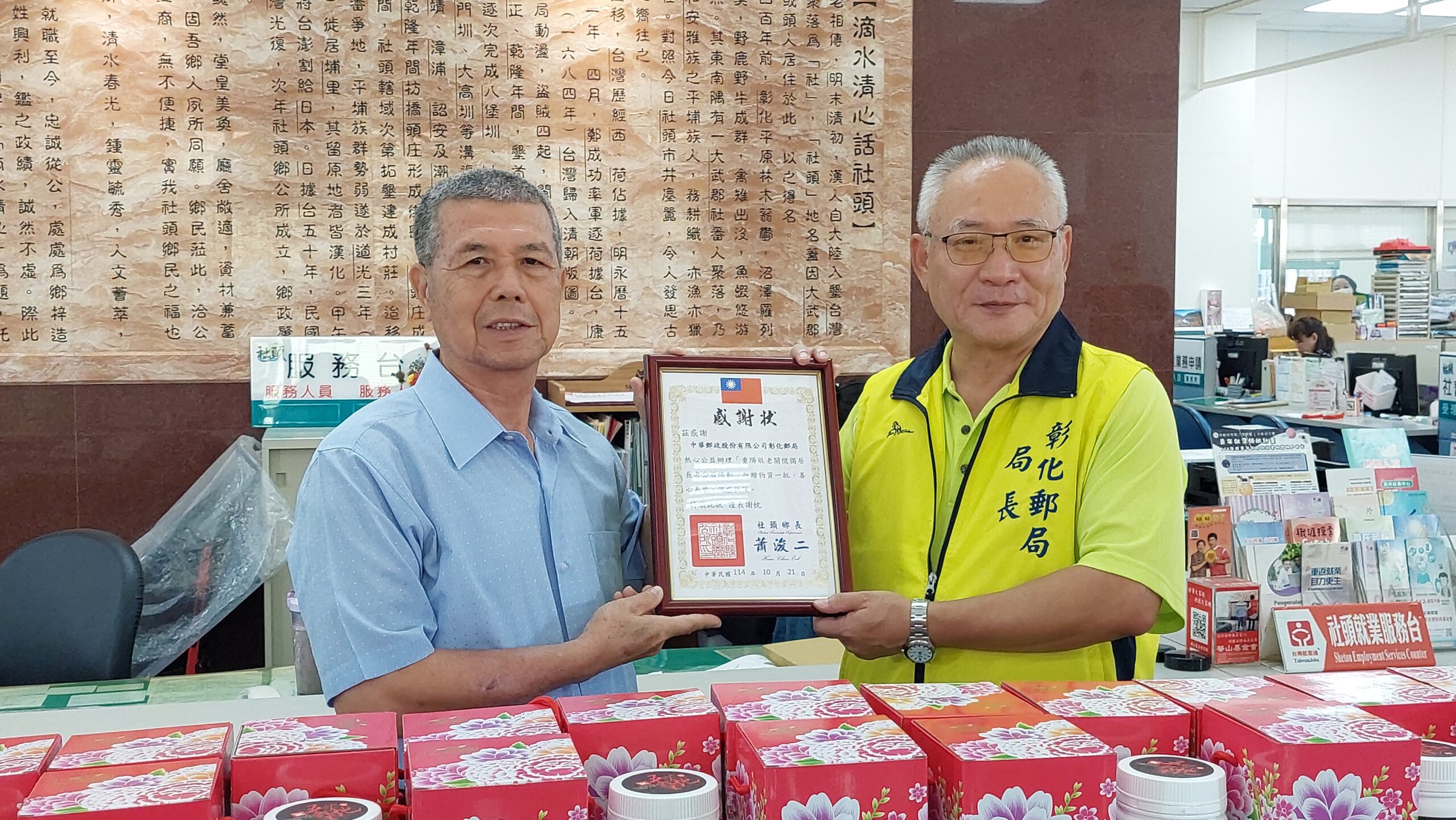 台灣郵政協會暨彰化郵局合作辦理重陽敬老關懷獨居長者公益活動,於今年10月21日上午由彰化郵局局長陳樂明率領郵務單位同仁前往社頭鄉公所交流拜訪,並特別致贈「養生膳食手提禮盒」180份,委由鄉公所轉發予轄內的獨居長者們。