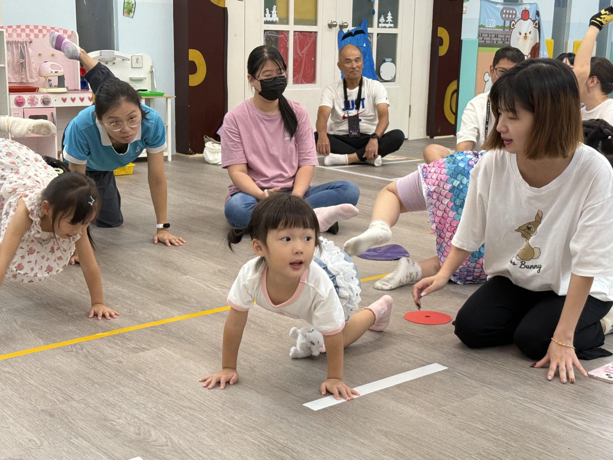 課程由黃雪芳老師及早資中心社工帶領,透過肢體伸展、節奏律動與按摩互動,讓親子一同體驗放鬆與陪伴的時光。黃老師以遊戲化、生活化的教學方式,引導家長觀察孩子的情緒與反應,並在活動中強化親子間的連結與理解,幫助家長從互動中看見孩子的努力與改變。