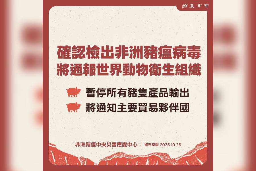 非洲豬瘟中央災害應變中心今(25)日表示,台中梧棲案場豬隻個案已確認分離出非洲豬瘟病毒,成台灣首例,農業部防檢署將向世界動物衛生組織(WOAH)通報本次案例,並暫時停止所有豬隻產品輸出、主動通知主要貿易夥伴國。