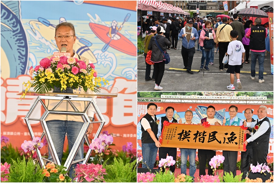 ▲南方澳鯖魚節現場頒贈匾額祝賀模範漁民,代理縣長林茂盛等人歡迎民眾參與盛會。(圖/宜蘭縣政府)