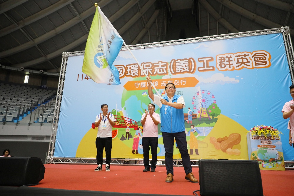▲全台2,000名環保志工熱情參與競賽,由苗栗縣環保局陳華盛局長(右一)揮旗,完成會旗交接儀式。(圖/主辦單位)