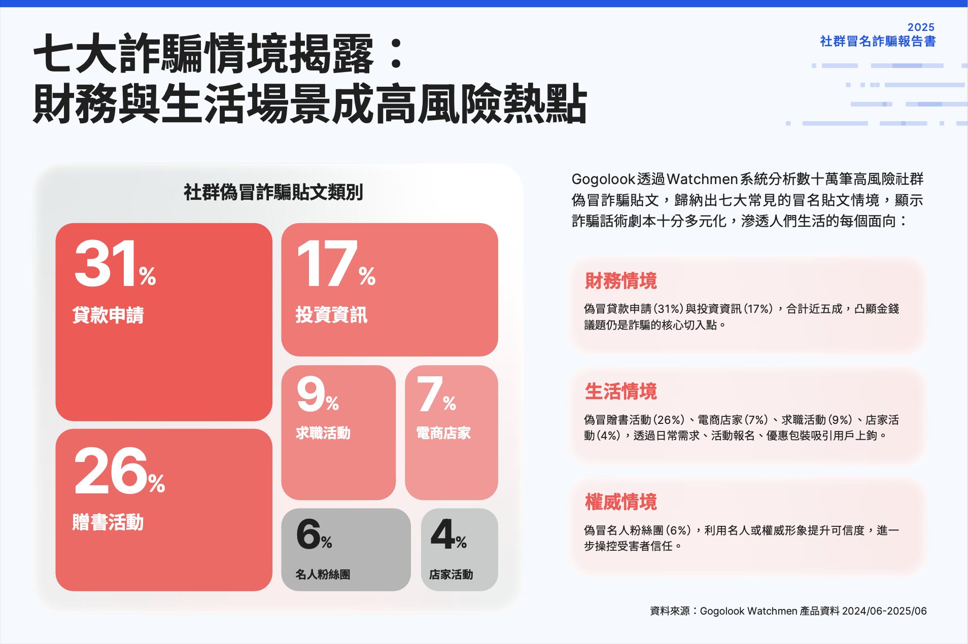 Gogolook 旗下商譽保護服務 Watchmen 分析 2024 年 6 月至 2025 年 6 月間數十萬筆可疑的社群貼文,歸納出七大主流偽冒情境,前三依序為:偽冒貸款申請(31%)、偽冒贈書活動(26%),以及偽冒投資資訊(17%),其中財務相關詐騙為最主要的詐騙切入點,包含貸款與投資詐騙,占比近五成。