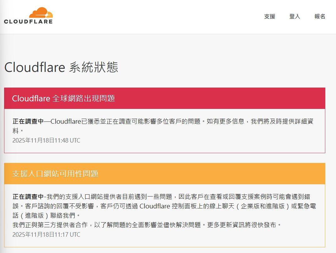全球知名網路服務提供商 Cloudflare 今(18)日晚間出現重大技術故障,導致全球多數地區的網路服務受影響,數億名使用者無法順利連線至網站或應用程式。目前 Cloudflare 官方已在其狀態頁面(Cloudflare Status) 上證實問題存在,並表示正全力調查中。