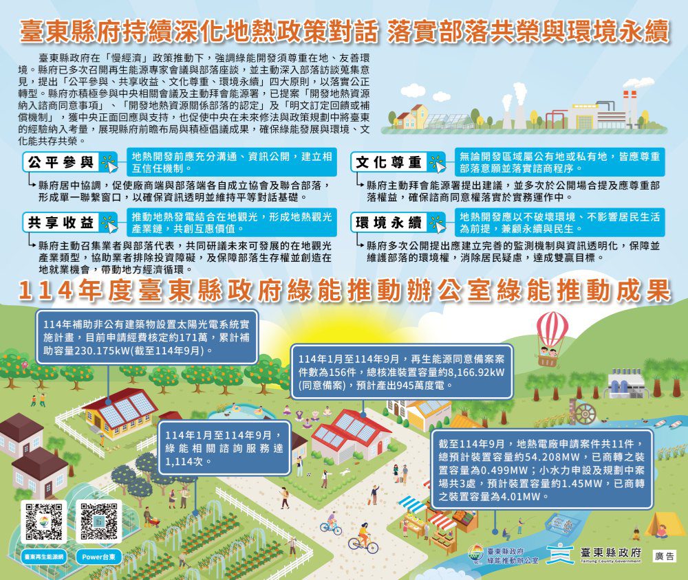 臺東縣政府持續積極地推動再生能源發展,在「慢經濟」政策推動下,綠能產業不僅被視為能源發展的關鍵,同時也是產業升級與地方創生的重要推動力量。強調開發須以尊重在地、友善環境為前提,自112年起臺東縣政府多次召開再生能源專家學者諮詢會議及部落座談會,屢次針對地熱開發相關議題展開討論,並主動下鄉與部落人員進行深入訪談,傾聽地方想法與意見。縣府強調,地熱開發推動應以「公平參與、共享收益、文化尊重、環境永續」四大原則為核心,貫徹「慢經濟」的核心價值,以落實公正轉型,確保綠能發展與環境、文化能共存共榮。