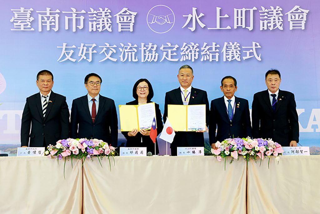 【記者吳玉惠/臺南報導】 臺南市議會與日本群馬縣水上町議會20日正式簽署友好交流協定,象徵兩地在多年友好互動上邁入更深度的夥伴關係。簽署儀式由臺南市議會議長邱莉莉與水上町議會議長小林洋共同代表議會簽署,黃偉哲市長與水上町町長阿部賢一親臨現場見證,場面隆重而溫馨。