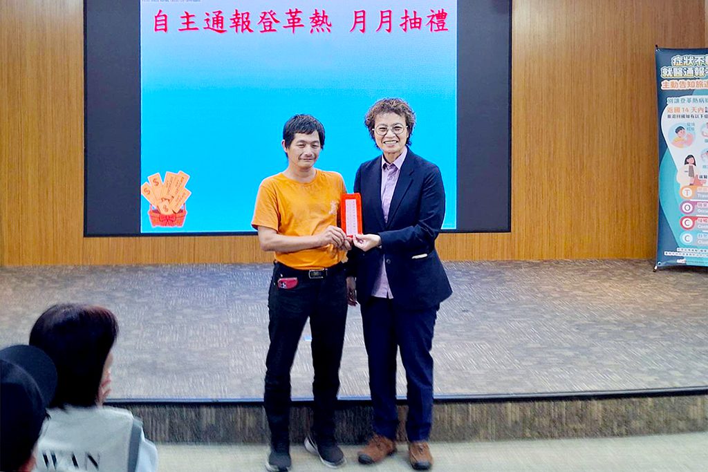 【記者吳玉惠/臺南報導】 臺南市自9月1日起舉辦「防治登革熱,自主通報月月抽禮券」活動,期強化民眾自主通報意識,喚起對登革熱防治的警覺心,鼓勵民眾於診所就診時善用自主通報,倘有國內外旅遊史或有疑似登革熱相關症狀即可掃描QR code填寫問卷,登防中心每月將抽出5名自主通報者,頒予500元禮券。11月3日由趙卿惠副市長頒發禮券給獲獎人。