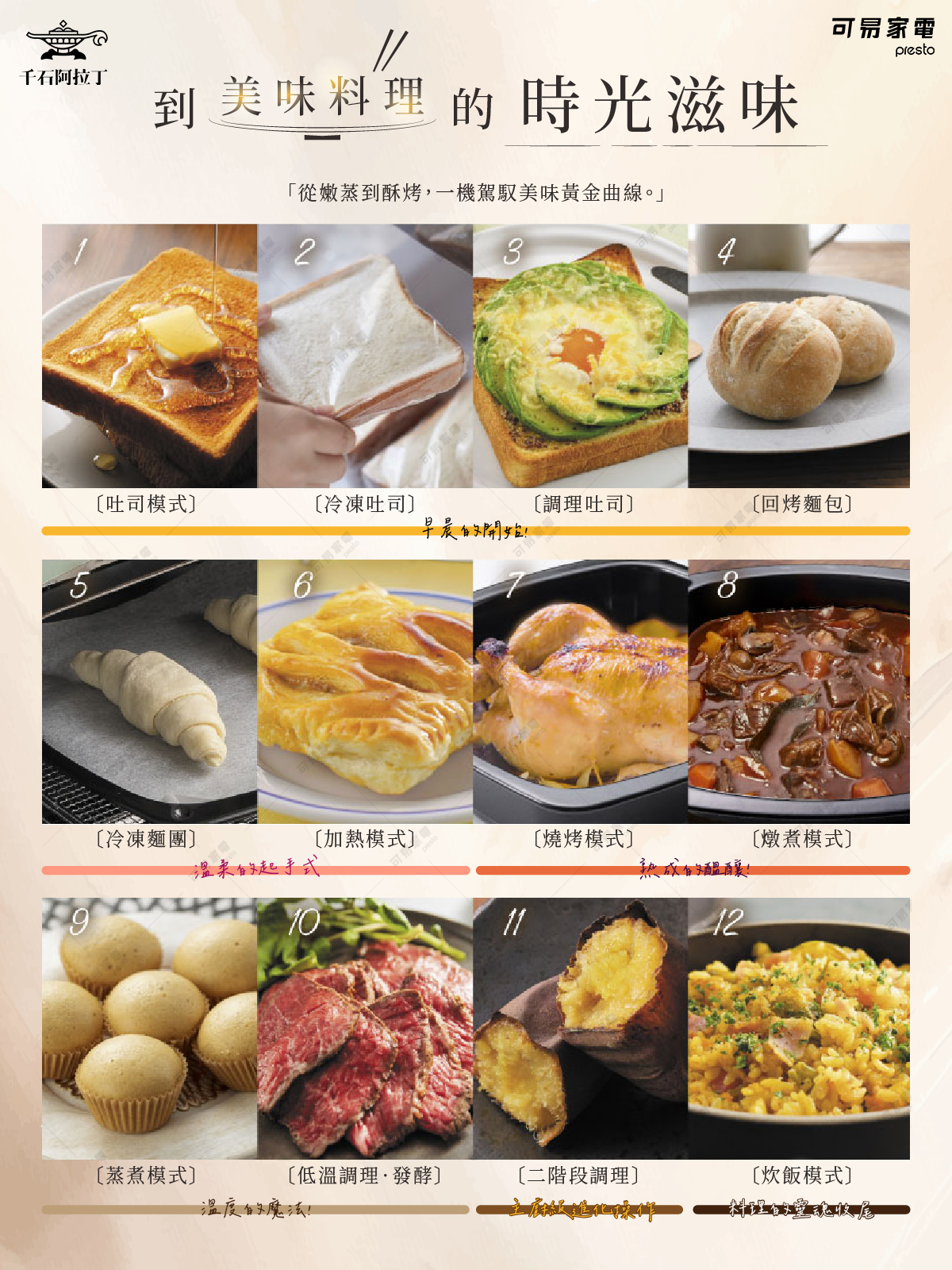 烤箱本身的亮點不少:採用獨家「遠紅外石墨加熱器」專利,只需 0.2 秒即可升溫,免預熱。從吐司、肉類、冷凍麵包一路到晚餐主食,一機搞定。內建12種智能模式,從低溫發酵、蒸煮、再加熱到雙階段烹調,料理小白也能輕鬆上手。