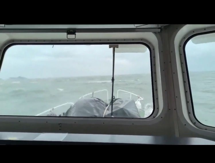 我分享兩段影片,一段是艇內拍攝,另一段是艇外攝影機畫面,影片顯示海巡在大浪中衝出去的景象,也說明他們工作態度的可貴!