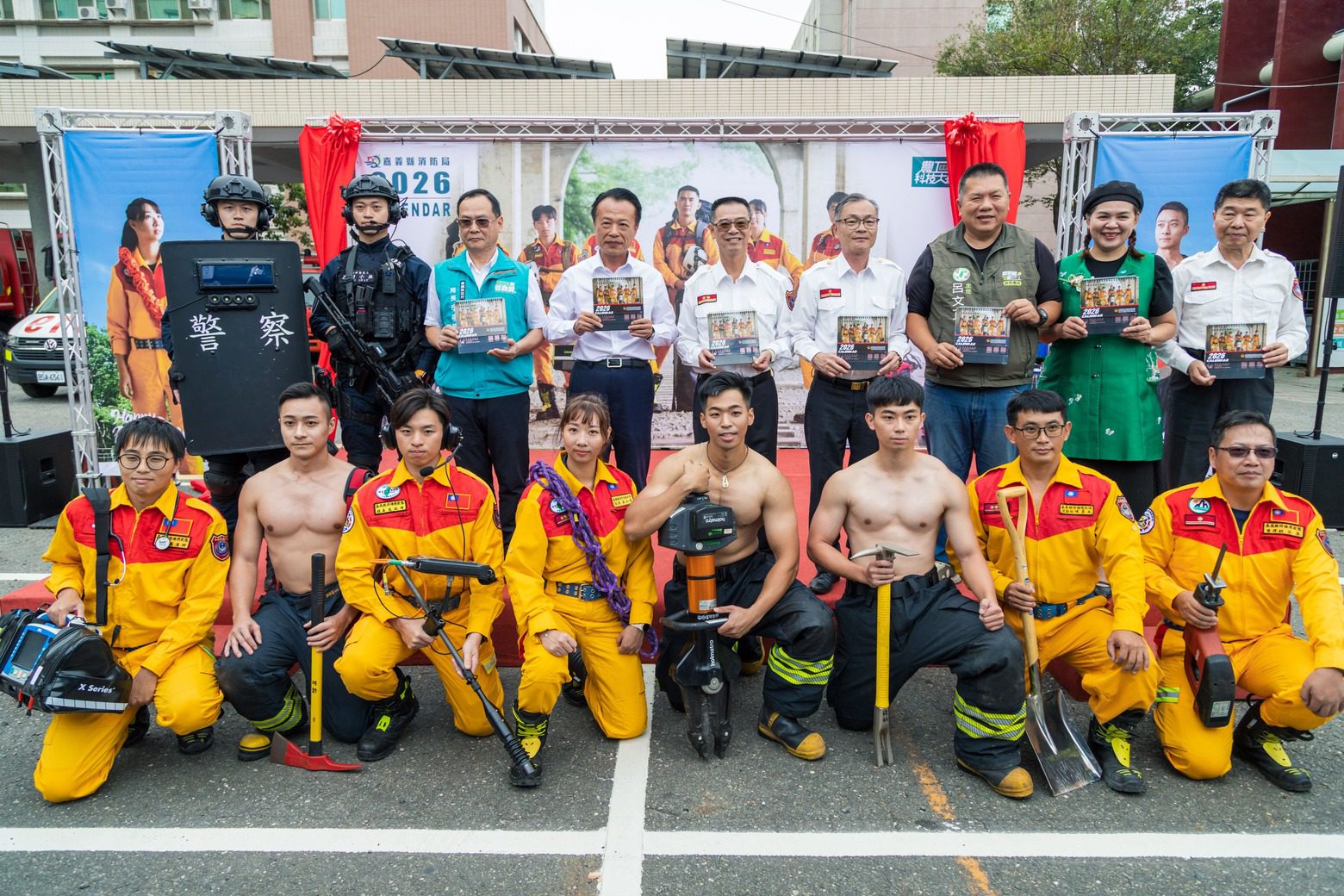 嘉義縣消防局 2026 馬年「猛男桌曆」今日(18日)正式亮相,以「嘉義縣特種搜救隊」為主題,集結消防人員、義消、醫師、護理師,並首度與縣警察局保安隊特勤人員跨界合作,共18人以專業體態詮釋警消聯手守護的力量。縣長翁章梁、消防局長蔡建安及多位貴賓共同出席,一同揭開桌曆首發序幕。