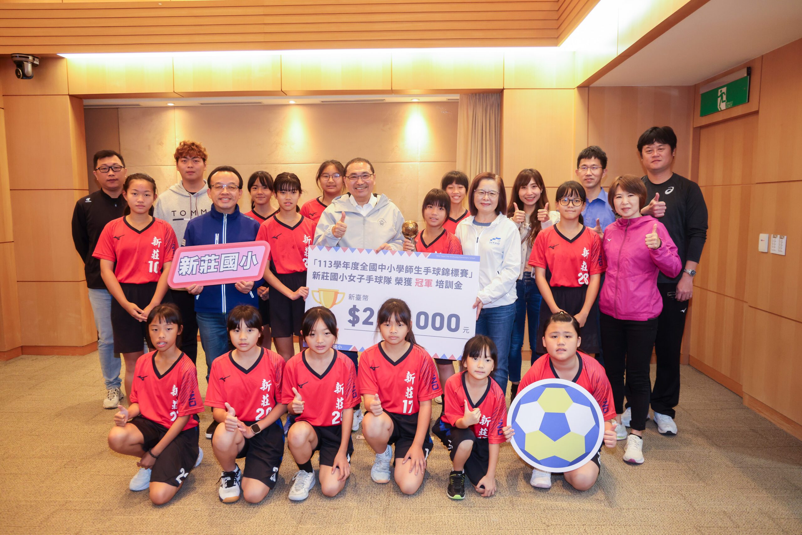 ▲新莊國小女子手球隊榮獲「113學年度全國中小學師生手球錦標賽」國小女子組冠軍,獲頒20萬元培訓金。(圖/新北市體育局 提供)