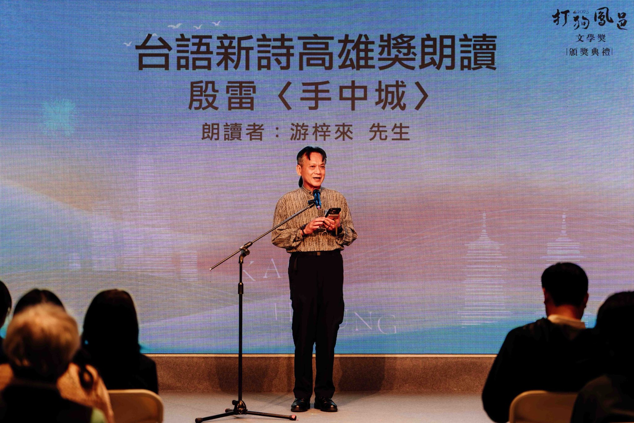 ▲台語新詩組首獎得主殷雷,由父親代為朗讀作品〈手中城〉。(圖/高雄市政府文化局提供)