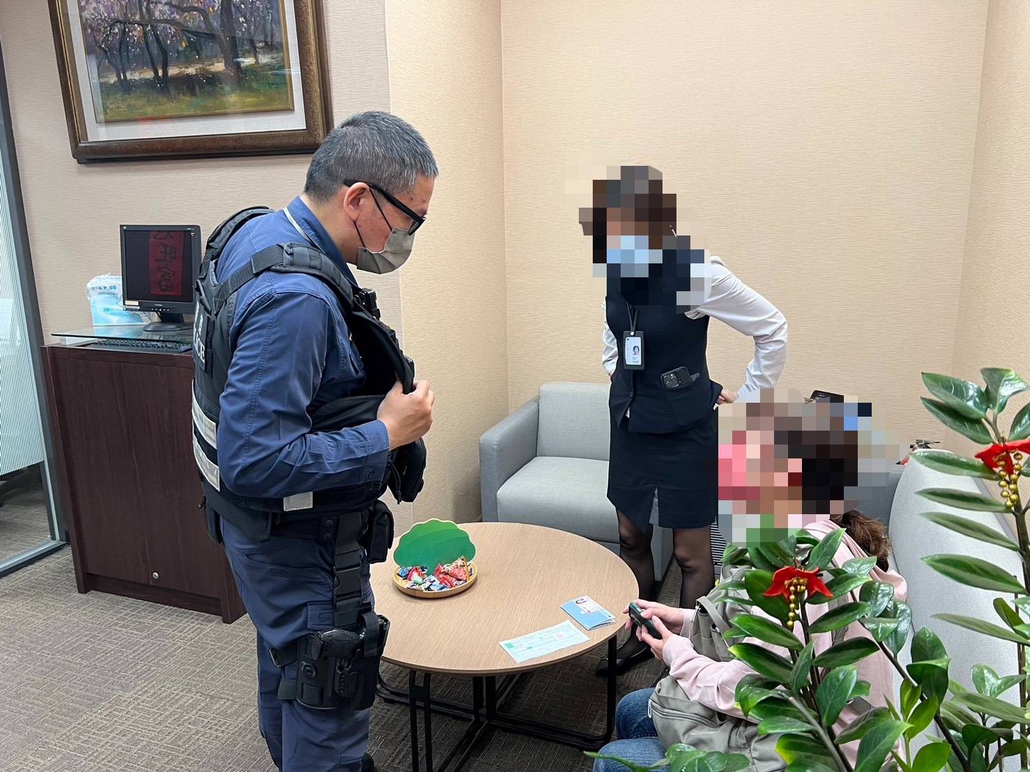 同日11時10分許,員警接獲轄區另一家銀行行員報案,稱55歲簡女欲匯款新台幣39萬餘元至渠友人宋女的帳號,經警方到場關懷提問,簡女堅稱該款項係向宋女購車之費用,惟經警方深入詢問,發現簡女並未與對方簽訂買賣契約,直接匯款恐遭詐騙,簡女在警方勸阻後中止匯款。