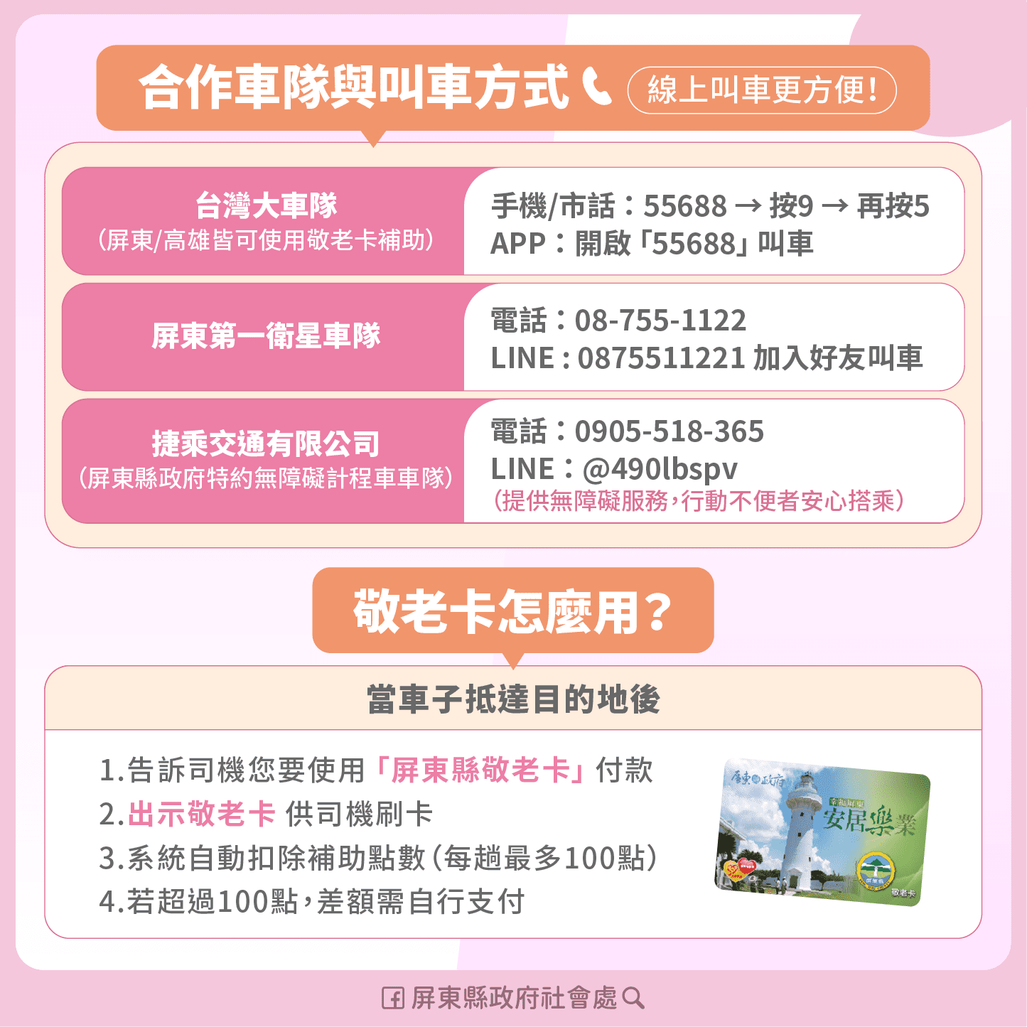 目前本縣合作車隊包括:台灣大車隊,屏東縣敬老卡在高雄叫 55688 也可使用!手機或市話撥 55688→按9→按5或使用 55688 APP 線上叫車;捷乘交通有限公司(縣府特約無障礙計程車)電話:0905-518-365,LINE ID叫車:@490lbspv;屏東第一衛星車隊,電話:08-755-1122,LINE ID叫車:0875511221。