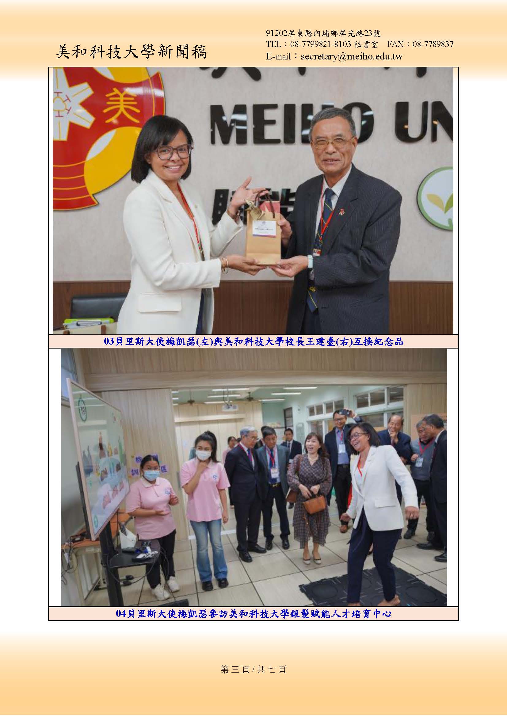 校長王建臺歡迎梅凱瑟大使及外交部參訪團蒞臨學校參訪。他表示,臺貝兩國建交滿36年,是臺灣重要的邦交國之一,而梅凱瑟大使是政大校友、20年前學成後回到貝里斯工商界發揮所長,如今以大使身份回臺,有機會參訪美和科大,並經由參觀特色教學場域,發掘雙方合作契機,促成未來教育及產學方面的合作,也期盼透過雙方交流,為臺灣與貝國友好關係注入新的動能,也為本校國際化進程再添新頁。