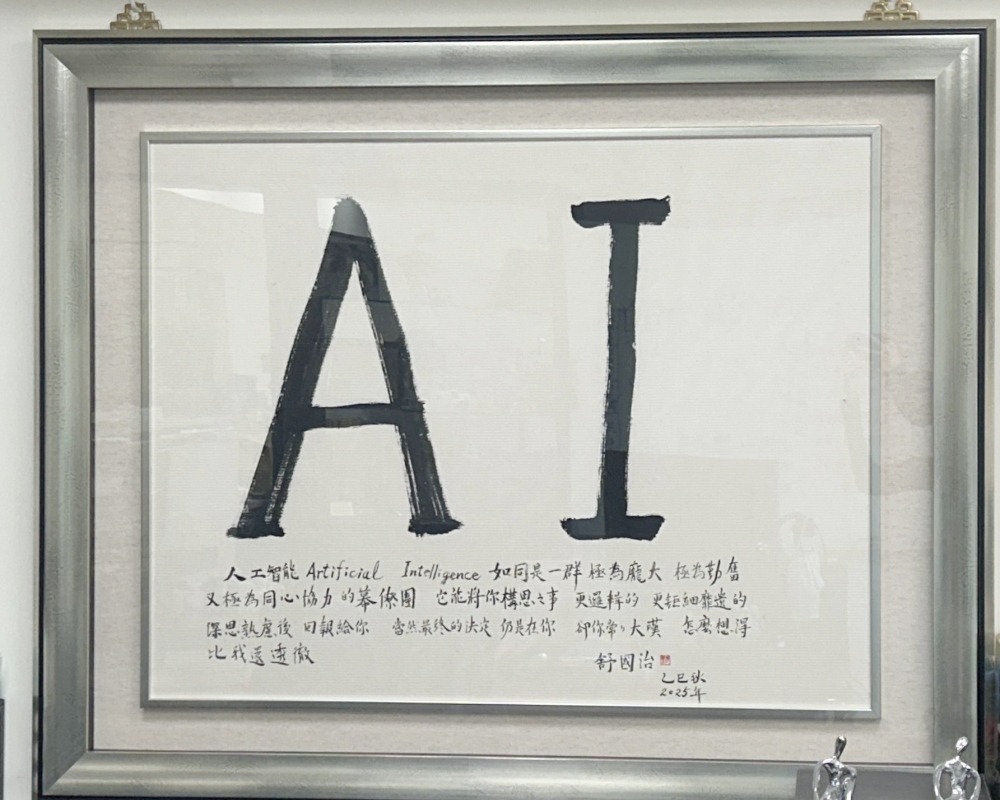 ▲旭榮執行董事黃冠華辦公室懸掛由作家舒國治書寫的掛軸,象徵以傳統工具詮釋AI思維,亦是對自身提醒,他強調人工智慧不能流於炫技,要讓AI走進日常工,賦能員工。(圖/旭榮提供)