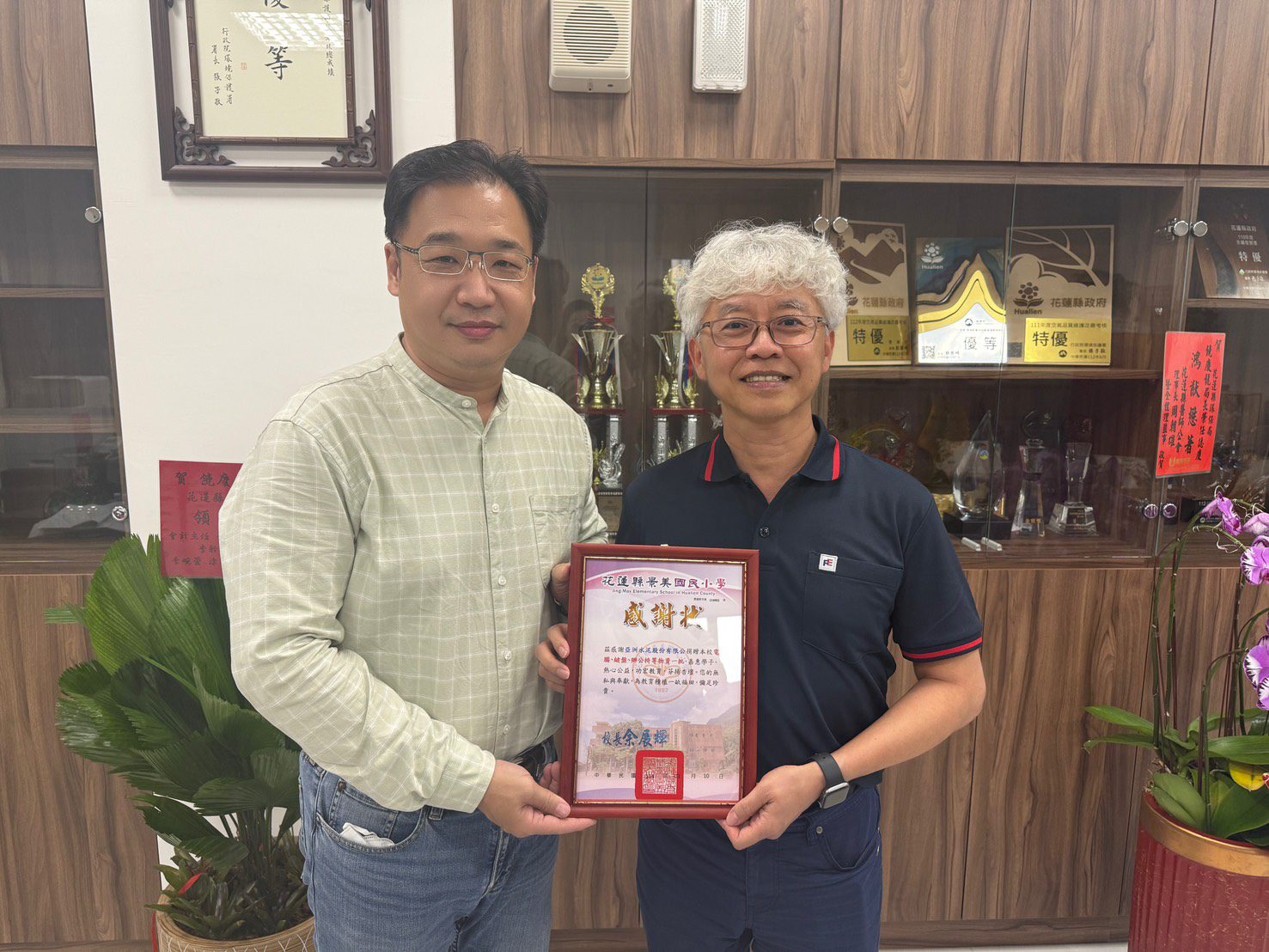 ▲景美國小總務主任林智偉(左)贈狀感謝亞泥公司首席副廠長陳志賢 (右)致贈再利用電腦等物品。 (圖/環保局提供)