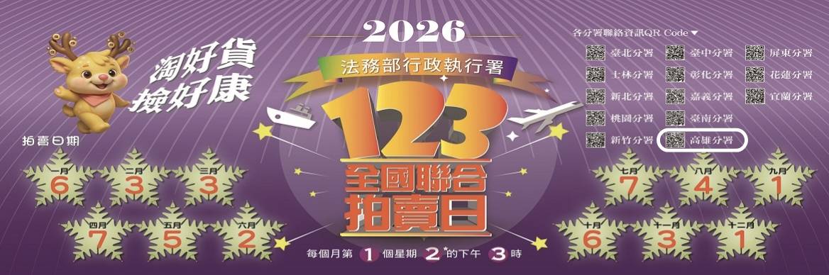 此次拍賣資訊已全數公布於高雄分署官網「應買人專區」,民眾可事先詳閱公告內容與注意事項,做好充分準備,提升應標成功機率。