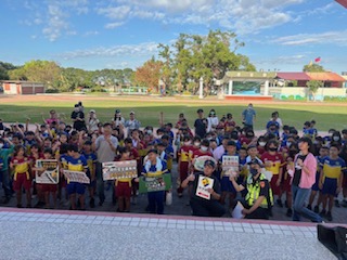 東港警分局交通組及新園分駐所警員高煜程於現場向師生宣導有關「停讓文化」及「行人安全」主題,推行人本交通精神,除提醒師生及家長們平時須遵守交通規則,也應有「防禦駕駛」觀念,此外也特別提醒騎乘腳踏車上學的學生騎乘時應戴好符合安全標章的安全帽並遵守交通號誌指示,行經路口時應謹記「慢、看、停」三口訣,以減少路口事故發生保護所有用路人的安全。