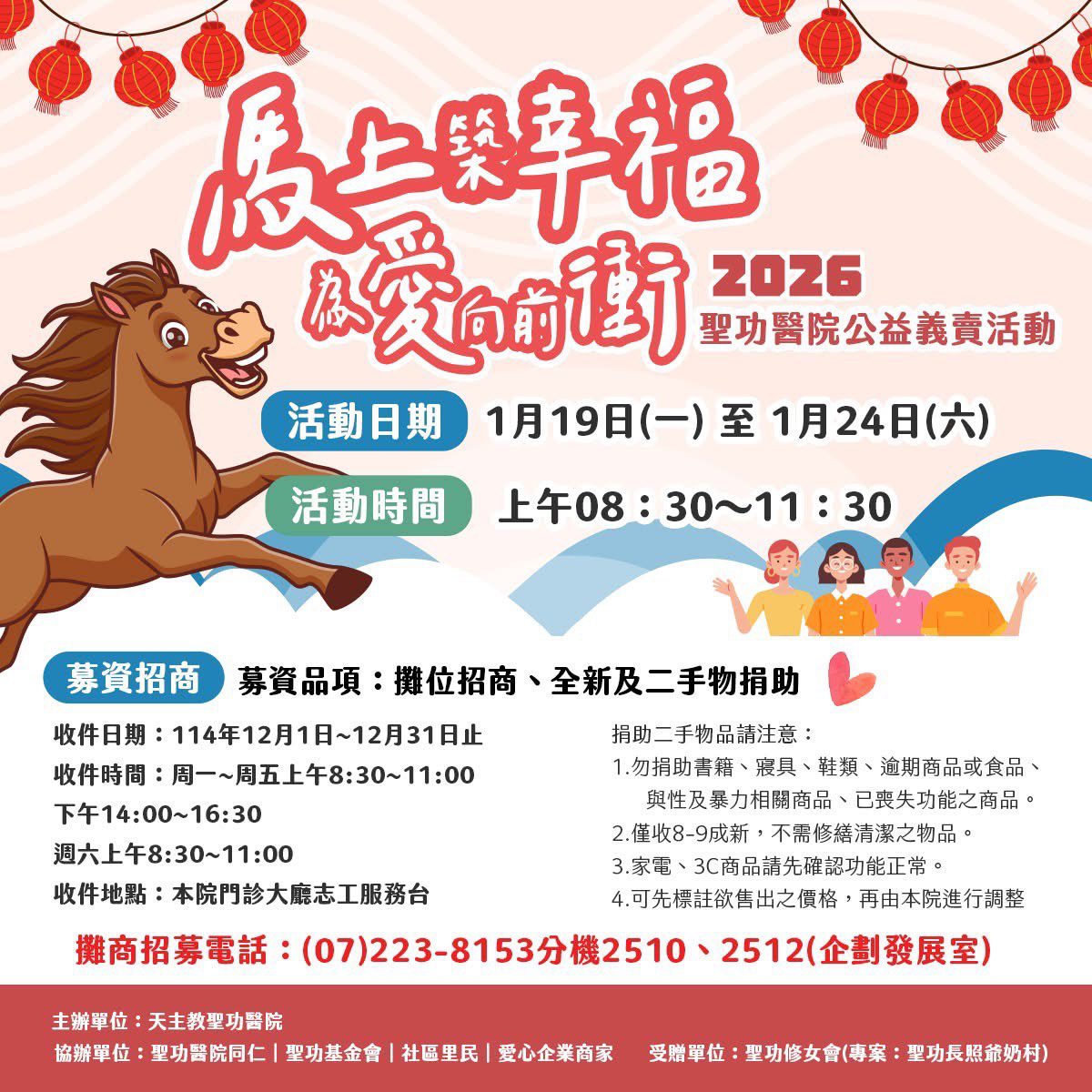 【記者蘇莉湘 / 高雄報導 】 高雄市天主教聖功醫院為陪伴更多失智、失能長輩安享晚年,即將舉辦的「馬上築幸福、為愛向前衝」2026公益義賣活動正式開跑,號召社會大眾以實際行動傳遞愛與關懷。活動將於2026年1月19-24日,共計六天每日上午08:30至11:30,在聖功醫院一樓陽光大廳溫暖登場,義賣所得將全數捐助籌建「聖功長照爺奶村」。