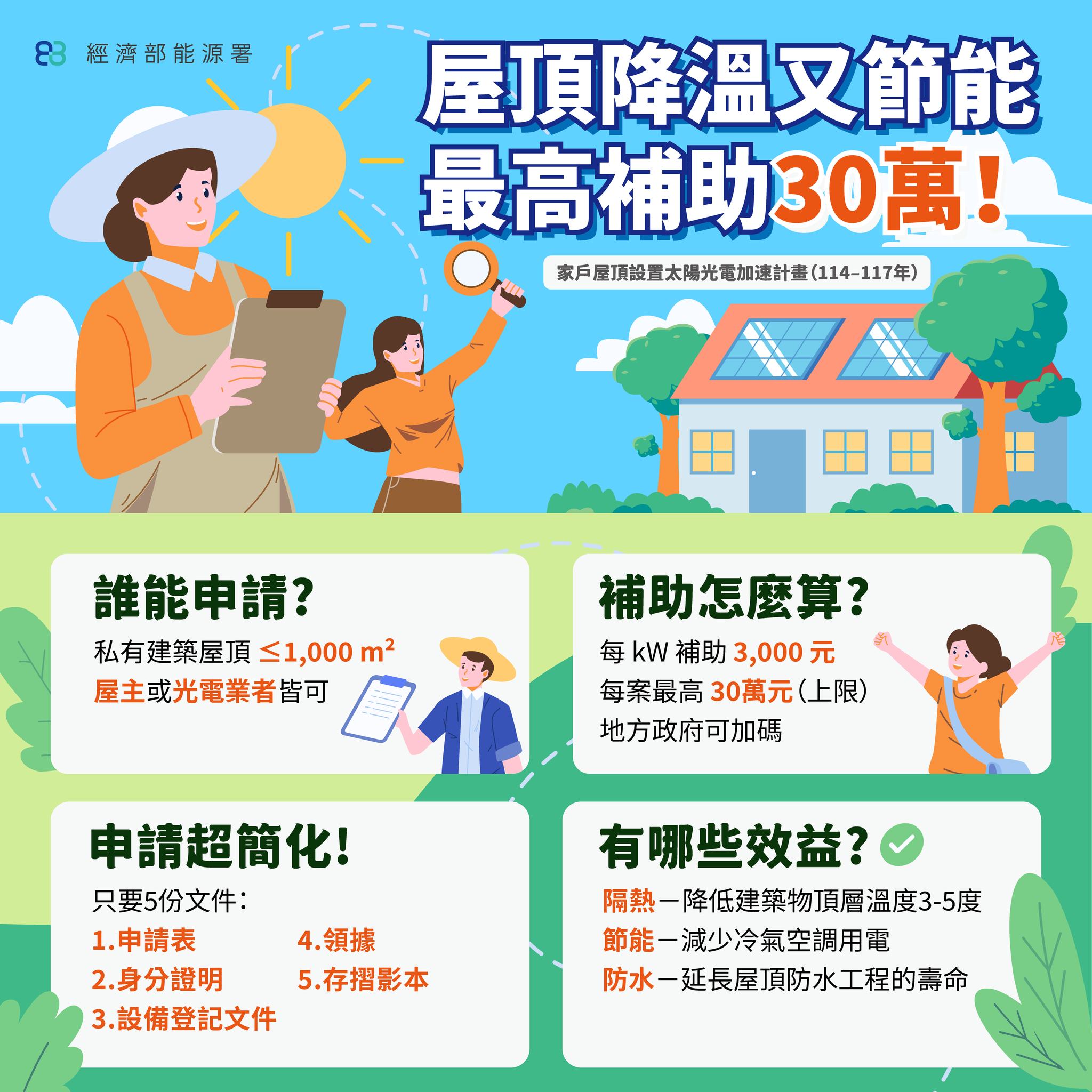 屏東縣政府城鄉發展處表示,本次計畫以「能源自主、供電韌性、全民參與」為理念,不僅補助新設置者,家戶若採取全數更換太陽光電發電設備,亦納入補助範圍,每瓩補助3,000元,最高30萬元;用電方式若採自發自用模式並加裝自動電源切換開關(ATS),每瓩補助金額高達2萬元,單一棟建築物最高可獲得200萬元補助。此外,透過本計畫產生的再生能源,家戶亦可評估申請再生能源憑證,取得官方核發的綠電證明,提升建築物價值與資產附加效益,未來在市場與企業ESG趨勢下將更具競爭力。