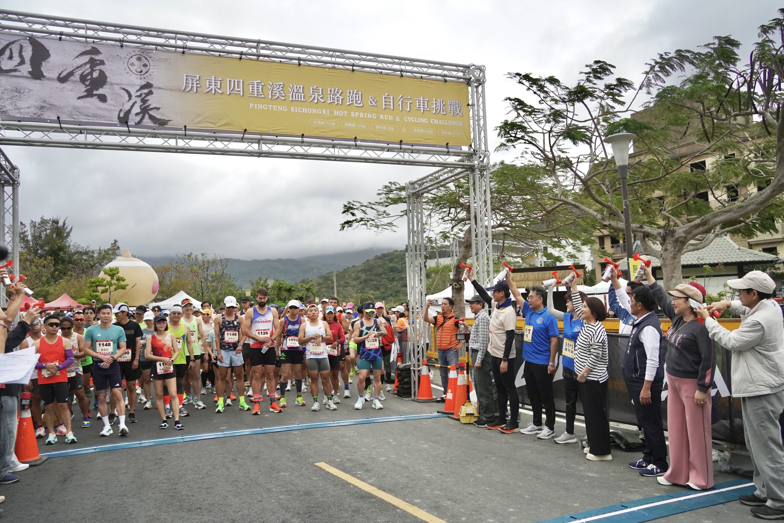 四重溪溫泉路跑活動現場,由專業教練帶領全場選手一起進行暖身操,數千名跑者隨著音樂節奏伸展、擺動身體,隨後,周縣長與各界貴賓共同按下喇叭,響亮汽笛聲劃破天際,選手們衝出起跑線,現場加油聲與歡呼聲此起彼落,為賽事揭開熱血序幕。