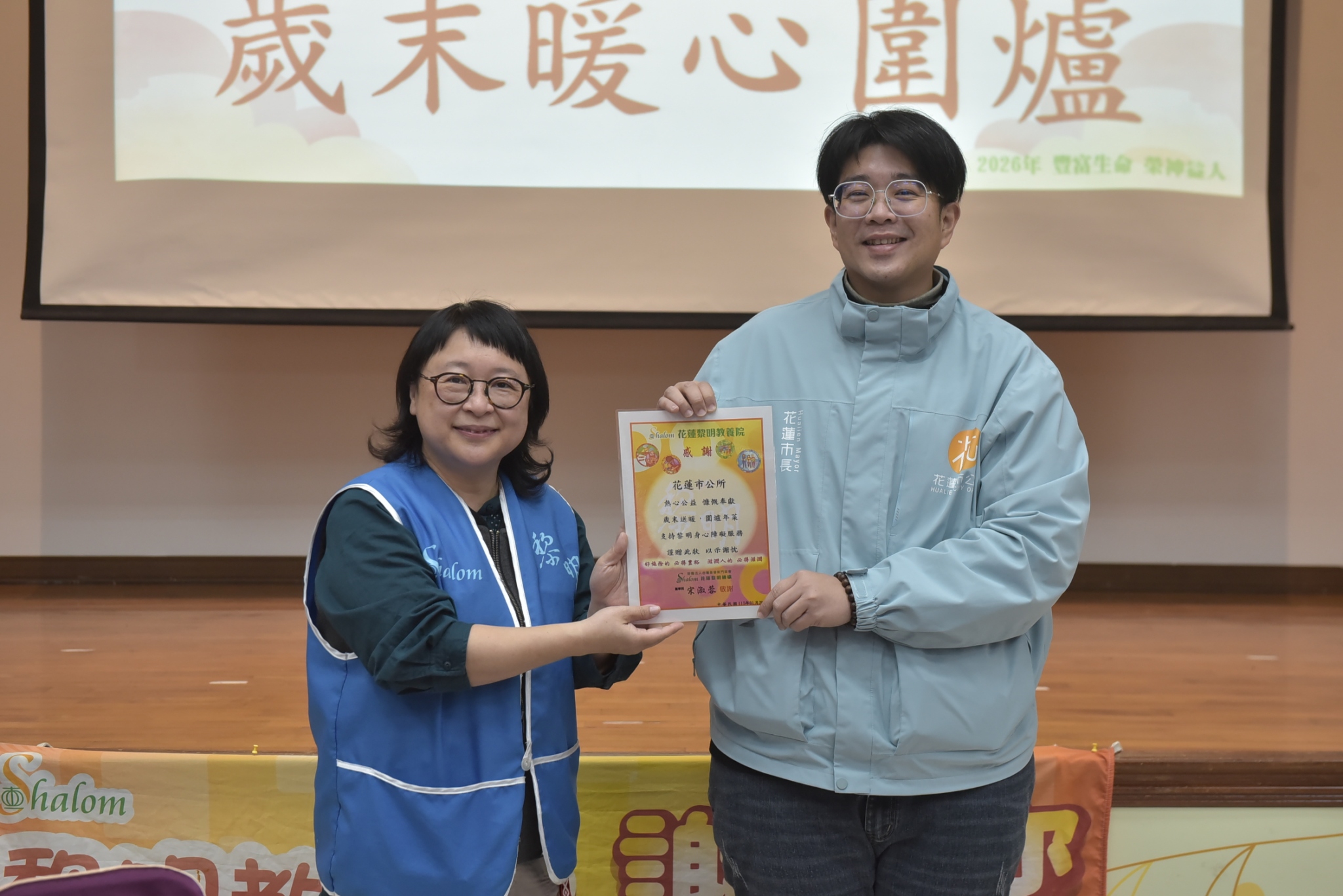 ▲黎明教養院長邱淑義(左)贈狀感市長魏嘉彥(右)致贈愛心年菜。(圖/花蓮市公所提供,下同)