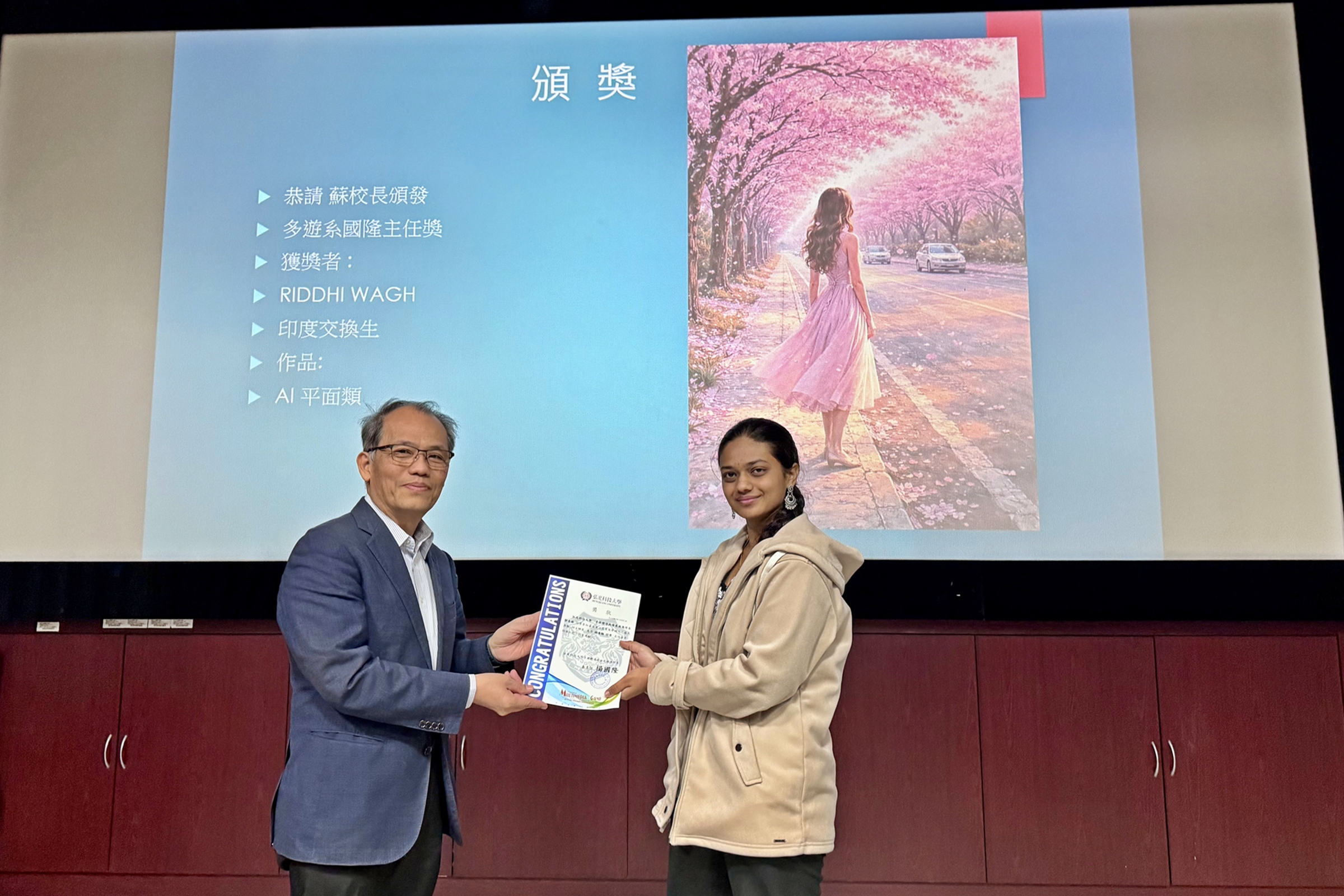 日前展覽開幕儀式中,特別安排頒獎環節以鼓勵師生創作。得獎名單中有兩件作品格外引人注目,一是來自印度的交換學生 Riddhi Anirudha Wagh,以AI平面類作品獲得系主任獎。作品主題為粉紅美女佇立於飄落的粉色花海中,風格唯美浪漫。Riddhi Anirudha Wagh說,因為對 AI 與 AR 創作充滿興趣,選擇到弘光科大多遊系進行半年的交換學習,能獲獎感到非常開心。