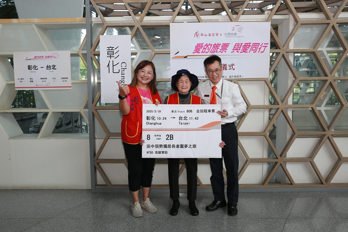 對彰化縣田中地區的弱勢、獨居長者而言,今年的春天很不一樣!今19日華山基金會在高鐵彰化站的協助下,帶25名田中鎮的阿公、阿嬤搭乘高鐵前往台北一日遊。出發前,高鐵彰化站李元弼站長特地致贈象徵性的高鐵大車票,祝福這次旅程順利圓滿,田中鎮蕭淑芬鎮長、彰化縣政府王玟升參議也蒞臨現場,陪長輩們開心合照、留下紀念。