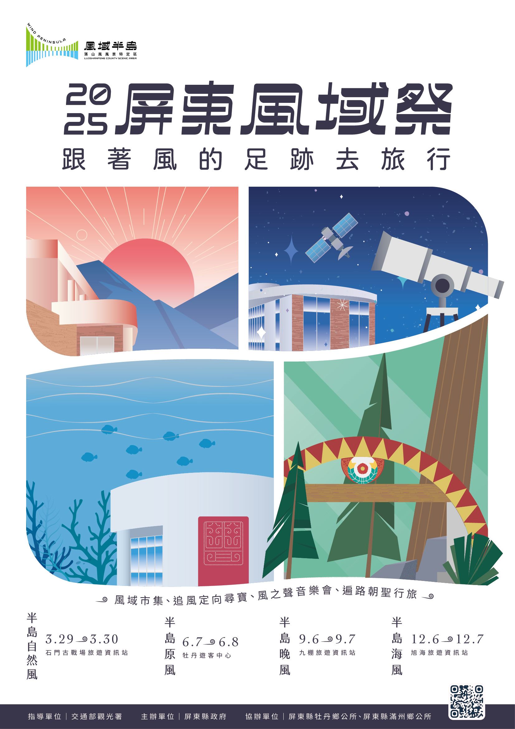 本次屏東風域祭將循著風的足跡發掘屬於風域半島的四季風貌,春季的「自然風」,將在春風輕拂下,於石門古戰場旅遊資訊站帶領走進林相豐富的石門山,透過自然體驗與文化探索,感受半島春天的生機與靜謐。夏季,以「原風」為題在牡丹遊客中心感受風域半島上多元族群與風共存的生活方式。秋季,在純淨夜空下前往九棚旅遊資訊站感受秋日微涼的「晚風」,體驗恆春半島獨特的夜間活動與在地文化。最後是冬季,讓我們一起走進落山風的故鄉,在旭海,與太平洋的風相遇,品味海洋文化,享受「海風」吹拂的自由與活力。