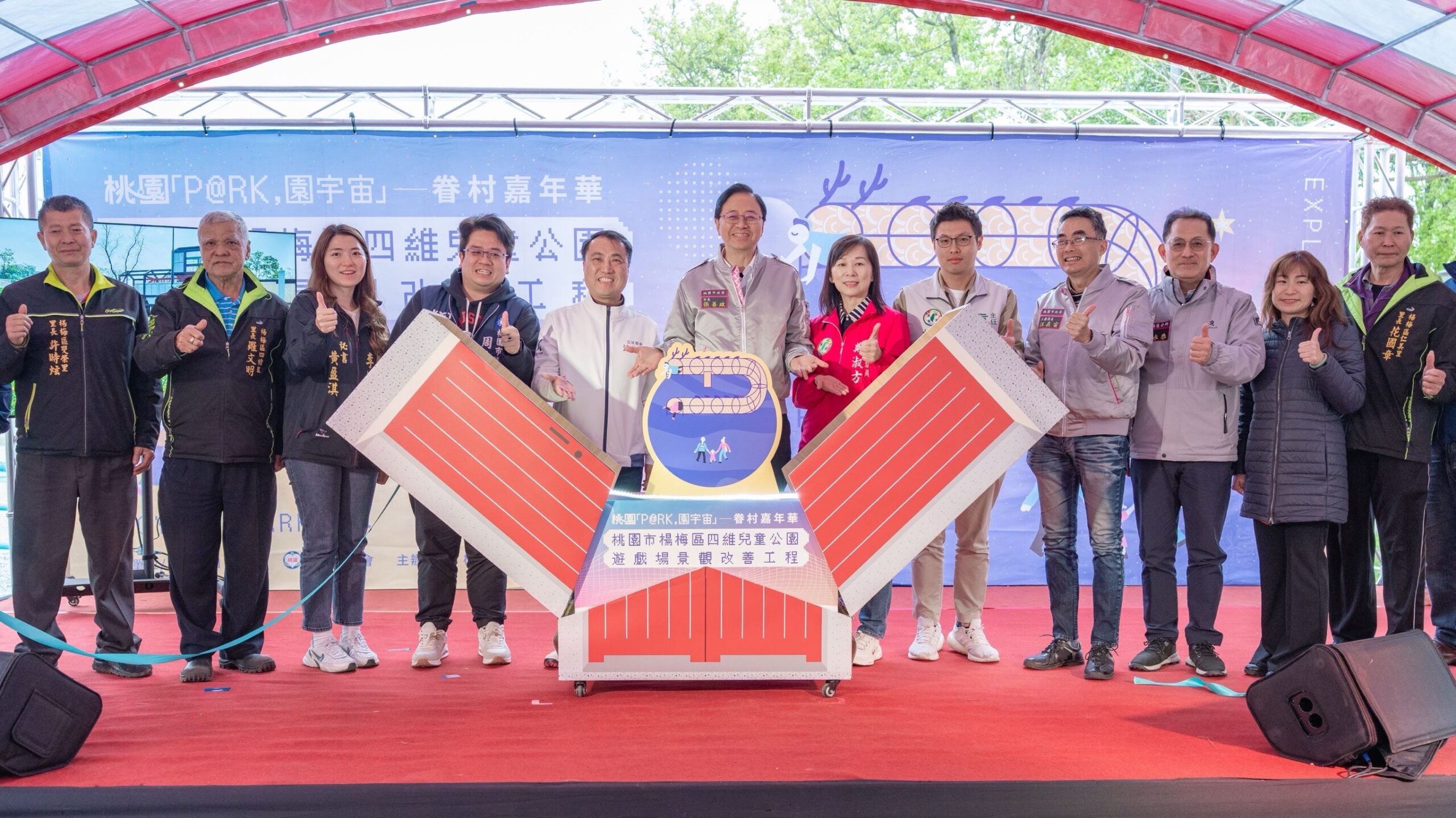 桃園市長張善政(18)日下午前往楊梅區,出席「楊梅四維兒童公園遊戲場景觀改善工程竣工啟用典禮」時表示,楊梅四維兒童公園改善工程自112年5月開工,於今(114)年1月完工,經工程驗收、遊戲場檢驗等程序後,今日正式開園。本工程不僅保留埔心在地眷村風情,更增設了適合不同年齡層遊憩的多樣化遊具,歡迎市民朋友前來體驗充滿樂趣與創意的遊憩空間。