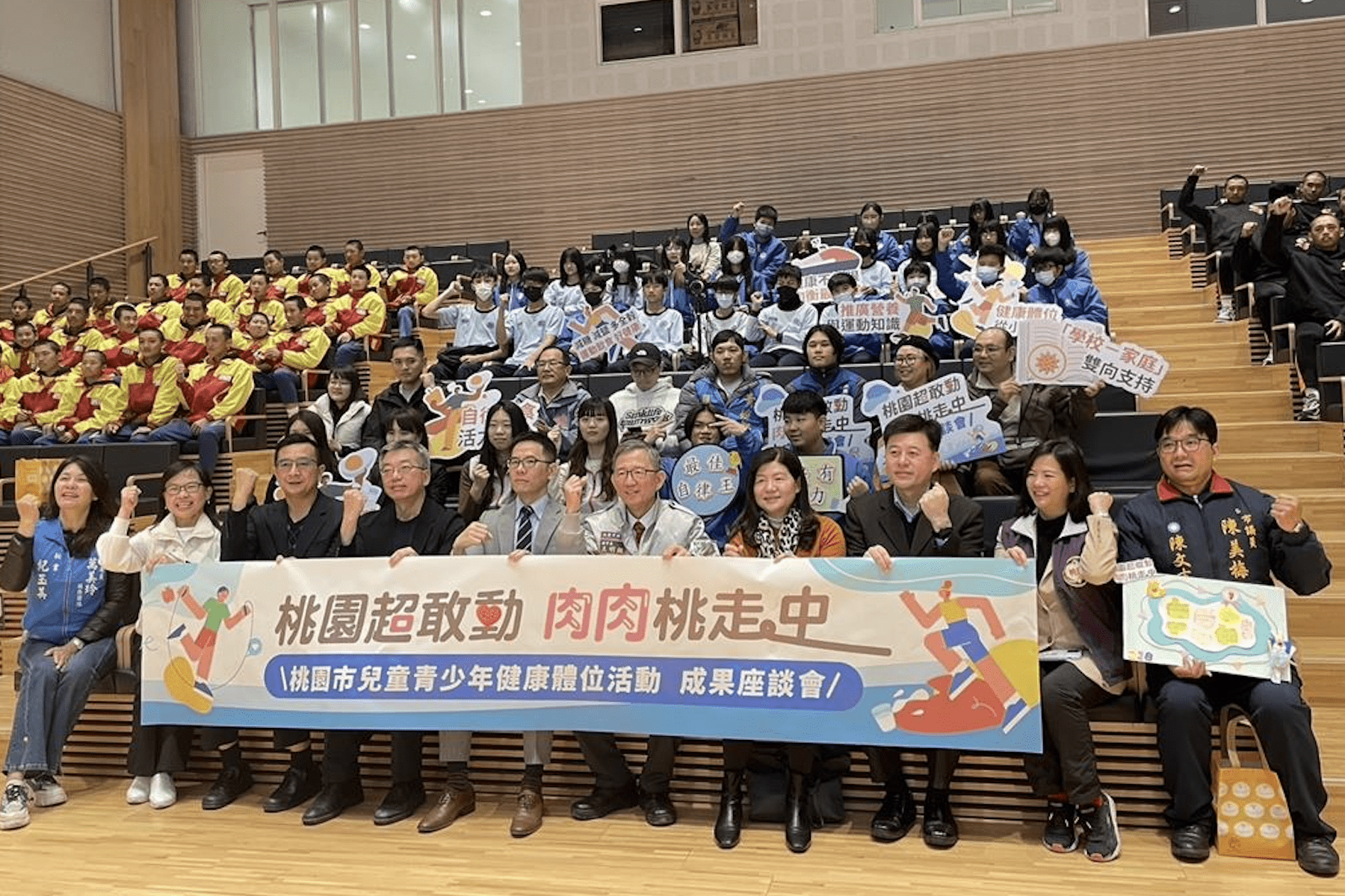 桃園市副市長王明鉅(18)日至桃園區參加「桃園超敢動 肉肉桃走中」成果座談會,本次活動由桃園市政府與台灣諾和諾德藥品股份公司首度合作,經過數月深耕與實踐,於成果座談會中回顧並見證這段努力的成果,此次活動吸引了來自55所學校的學生、家長及老師熱烈響應,並將健康體位管理的理念扎根於學校與家庭之間,促使健康意識從學校開始落實。