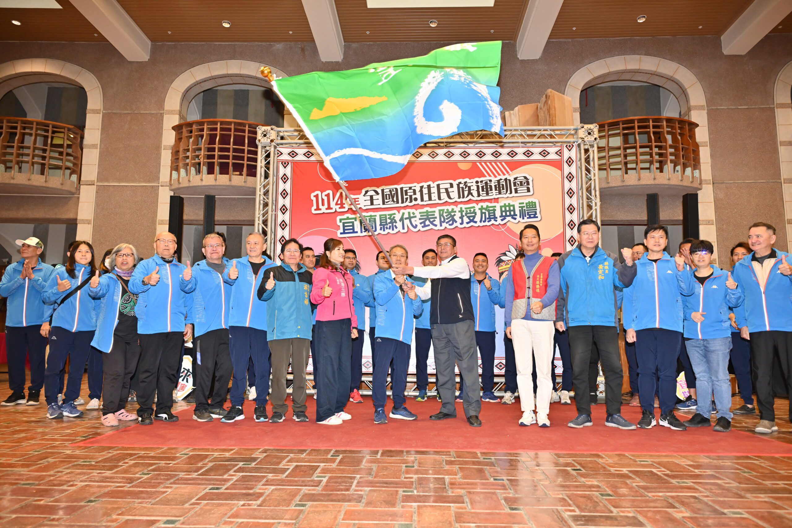 「114年全國原住民族運動會」宜蘭縣代表隊授旗典禮,17日在縣民大廳舉行,宜蘭縣體育會常務理事陳鏗芳從代理縣長林茂盛手中接下旗幟,林茂盛勉勵選手們在競技場上發揮日常訓練實力,展現努力不懈,來為爭取個人最佳成績,為宜蘭奪金,這項賽事將自21日起至24日,在高雄市展開序幕,宜蘭縣共參加17項競賽種類,合計746位隊職員選手參賽,參賽人數為歷年之最。