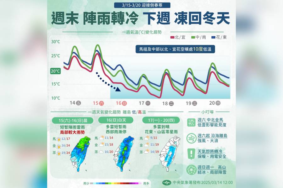 氣象署在「報天氣 – 中央氣象署」臉書粉專說明,周六將是分水嶺,鋒面通過時「不定時」有陣雨雷雨,由其中北部降雨較明顯,等到鋒面通過後,周日到下周受強冷空氣影響,將「凍回冬天」,其中,周六周日清晨鋒面通過,易有短暫陣雨雷雨,中部以北、基隆北海岸、澎湖、金門、馬祖留意較大雨勢,下午起冷氣團南下,由北而南降溫。