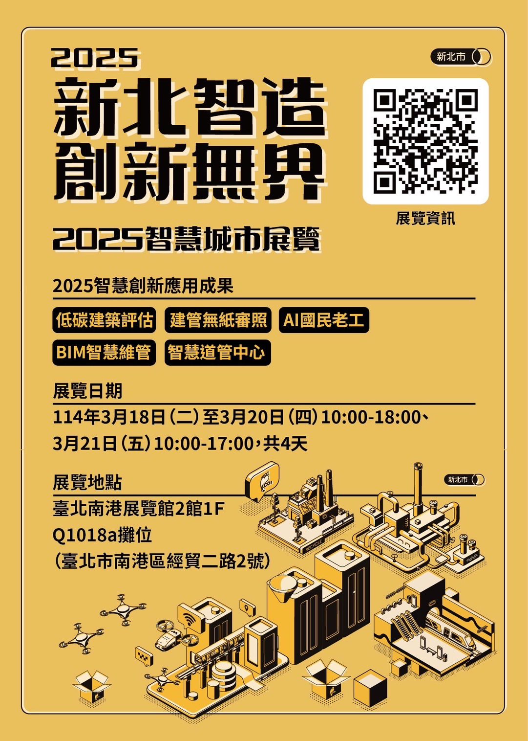由台北市電腦商業同業公會智慧城市推動中心舉辦的「2025智慧城市展暨淨零城市展」,新北市政府工務局在縣市創新應用組榮獲「智慧城市創新應用獎」並應邀參展。本次主題為「數位與綠色雙軸轉型」,分別在台北及高雄展出,也是亞洲最大的智慧城市專業會展,預料將吸引來自海內外專業人士到場。