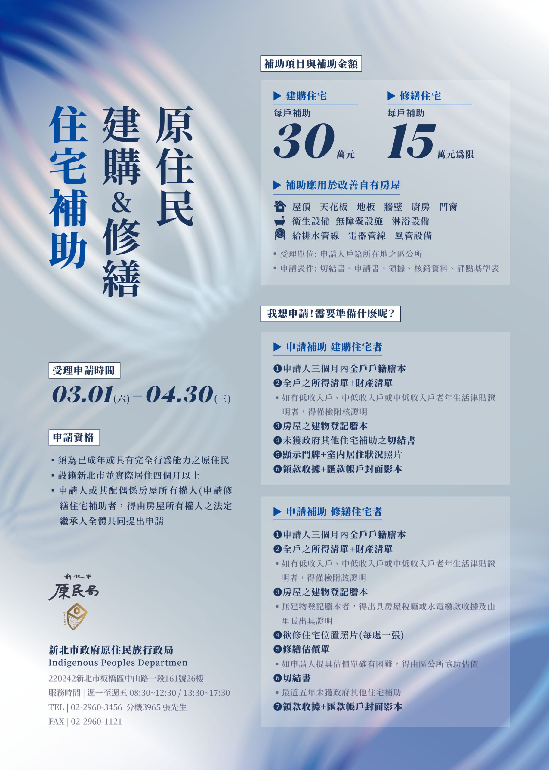 另外,因應族人的實際需求,今年適度調整放寬申請資格及條件,首先,考量建購住宅補助的申請需求逐年上升,從今年度開始,申請年限從買房2年內可申請,延長至3年內。而為讓許多具長期居住事實,卻因文化差異無法順利完成繼承登記作業的族人,能夠申請修繕補助,申請資格也放寬為-可由房屋所有權人之全體繼承人共同提出申請。提醒有意申請的族人,即日起至4月30日止,備妥申請文件,向戶籍所在地區公所送件申請。若有相關問題,可於週一至週五早上8:30~12:00、13:30~17:00電洽新北市原民局社福科承辦人張先生(02-29603456轉3965),將有專人替您服務。