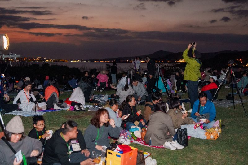 屏東星空大使施世治則率天文協會志工提供專業望遠鏡在現場導覽解說,其中包括經緯儀式望遠鏡,可以看和恆春建城跨越150光年相遇的金牛座畢宿星團,以及赤道儀望遠鏡、大口徑DOB望遠鏡,適合觀賞木星條紋、大紅斑及太陽系四大衛星,還有四組智慧攝星儀,能夠用手機拍攝深空天體,參加群眾中有不少外縣市朋友,最遠從台北專程而來,也有人臨時看到活動趕來參加,現場湧入超過500人,大家在草地上或坐或臥,伴隨海風及浪潮聲看星星,氣氛輕鬆寫意。
