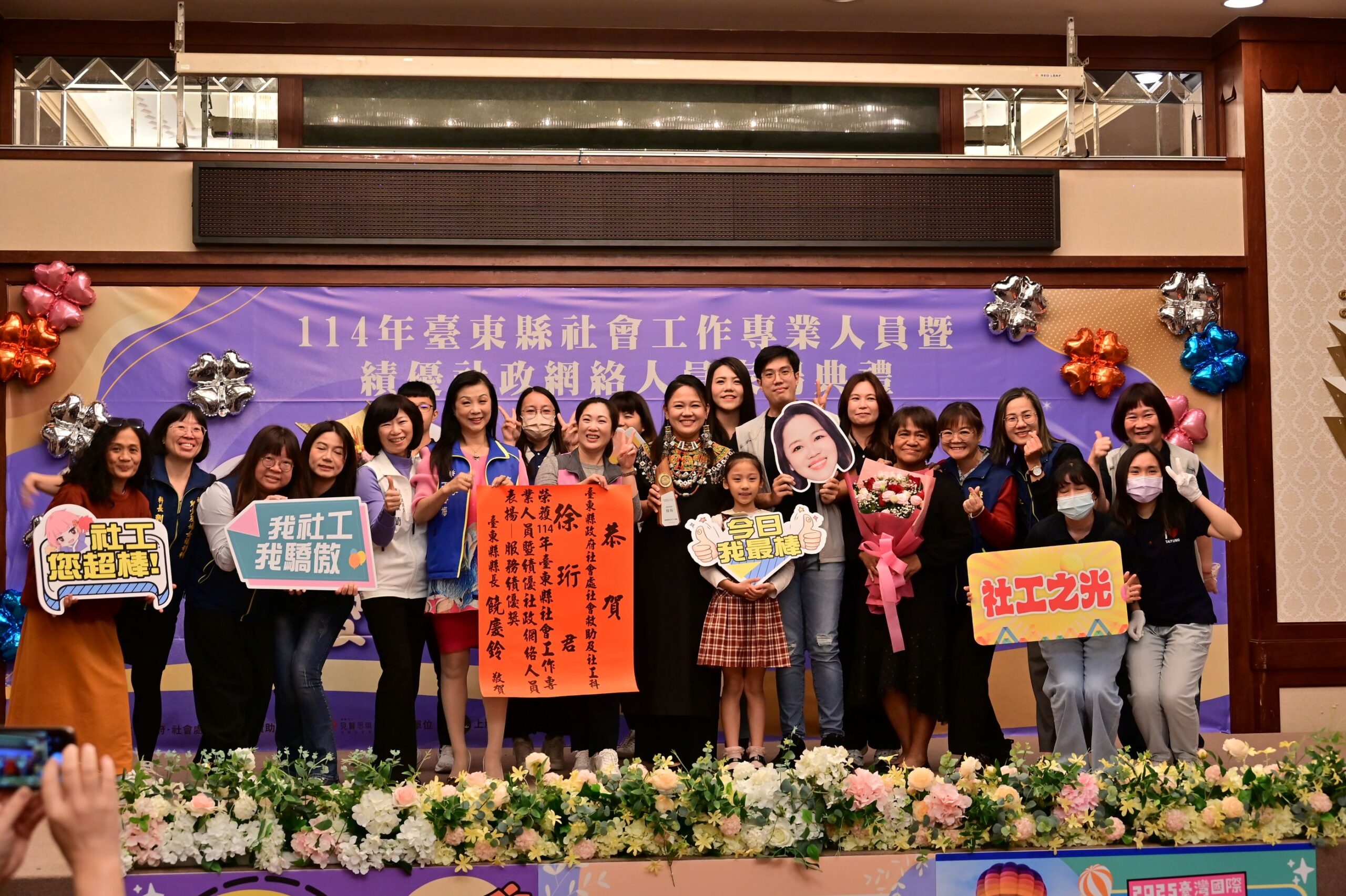 「114年臺東縣社會工作專業人員暨績優社政網絡人員表揚活動」,22日舉行,頒發七大類獎項,25位優秀社工及社政夥伴獲獎,縣長饒慶鈴感謝大家共同築起溫暖社會安全網,並表示社工夥伴是臺東最溫暖力量,將持續提供資源,做大家堅實後盾,讓社工更安心投入服務。