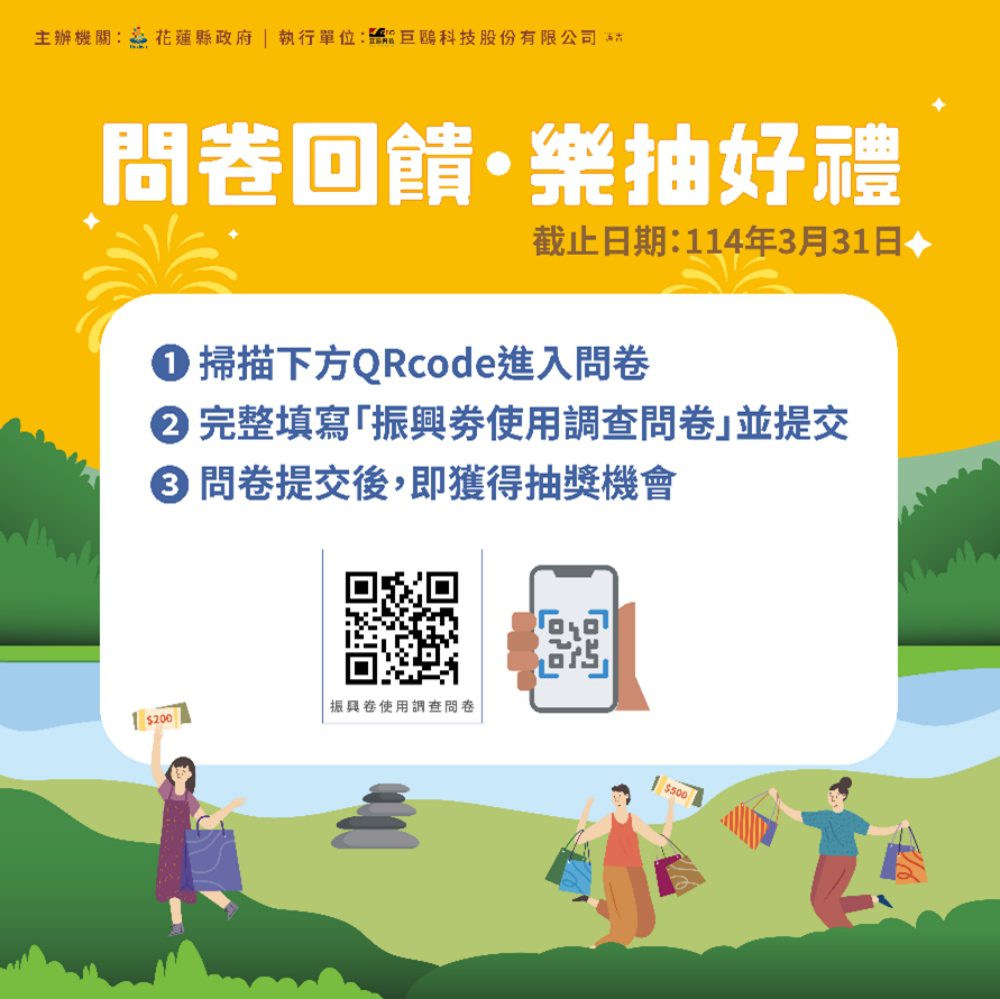 另一方面,為蒐集縣民使用振興券的實際體驗與建議,縣府同步推動「振興券使用體驗調查」,邀請民眾與店家分享使用經驗與建議,問卷調查開放至114年3月31日止,凡完整填寫線上問卷者,皆可參加抽獎活動,歡迎大家提供意見。 (問卷連結:https://www.3000-hualien.com/花蓮振興券問卷調查)
