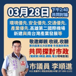 李順進表示,未來在南興建第二機場議題,感謝陳市長、交通部長官期勉,都希望在南興建造高雄第二機場,但是否可行?先以小港至林園捷運紅線延伸線來看,已水到渠成,但沿海遷村居民認為未來隨著國際機場、洲際三期、石化循環園區等興建,林園捷運延伸、高鐵南沿交通便捷,都有門口可能是希爾頓、麥當勞願景,請問市長填海造陸建國際機場,以及捷運延伸至機場預定地可行性?