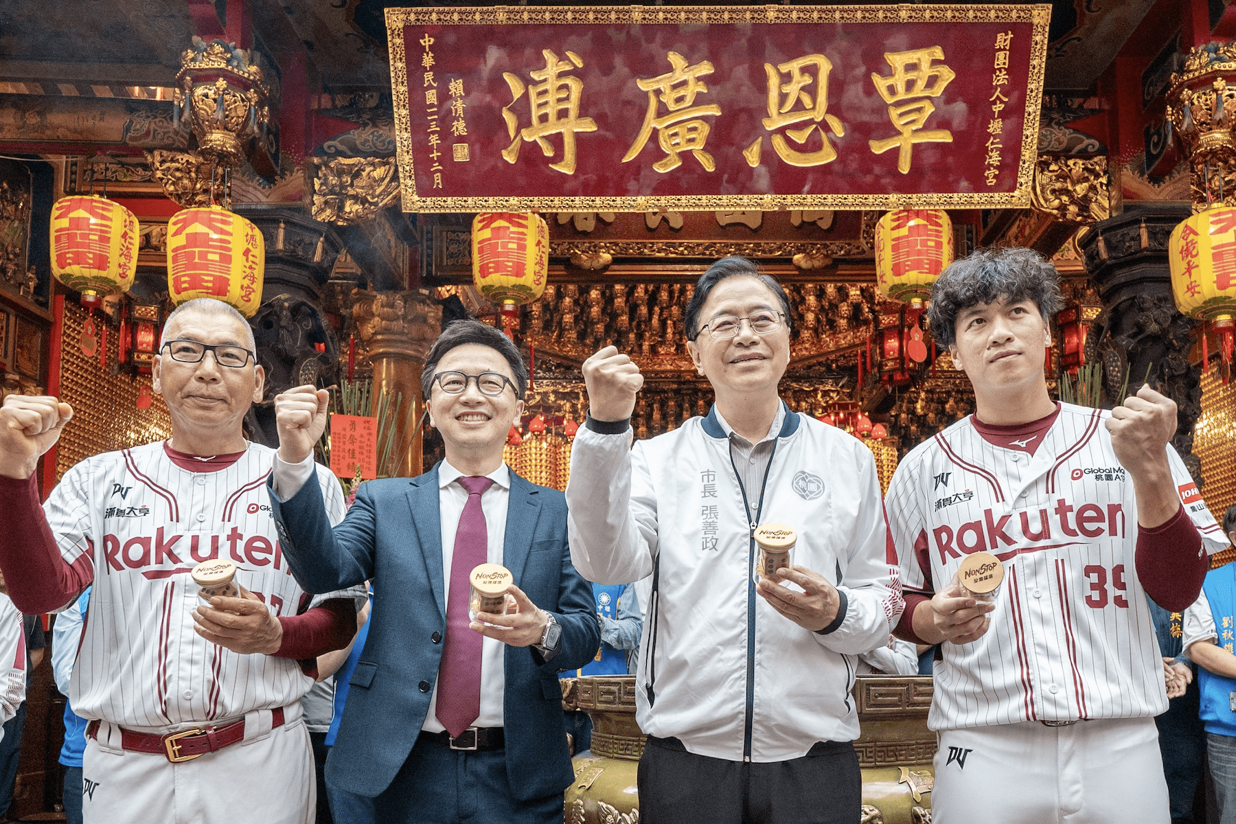 中壢仁海宮董事長王介禧表示,感謝張市長對宗教文化與體育發展的全力支持,讓宗教信仰與棒球運動相結合,成為全民共享的盛事。今(114)年也適逢中壢仁海宮創建200周年,特別準備金獅及發財金贈予球團,期盼為球團帶來好運,祝福樂天桃猿棒球隊旗開得勝,勇奪佳績。