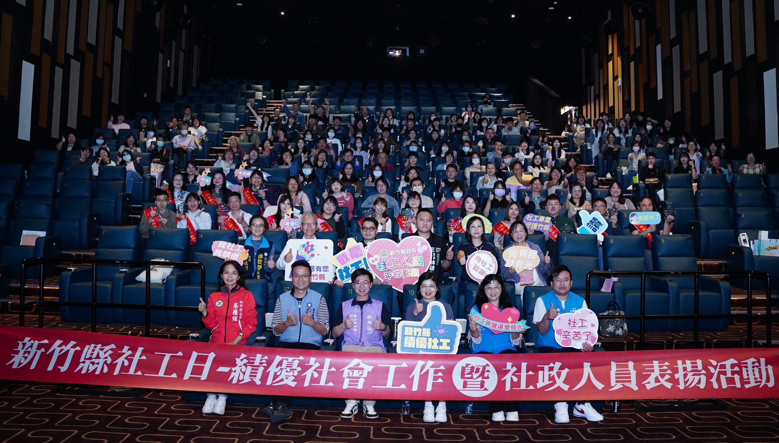 為表彰在社福領域中表現傑出的社工人員及社政人員,新竹縣政府每年舉辦表揚活動,今(27日)首次在享平方百老匯影城舉辦「114年度新竹縣社工日-績優社會工作暨社政人員表揚典禮」,由秘書長李安妤代表縣長楊文科頒發獎座及住宿券給予15位績優人員,同時一起在電影院欣賞獲獎者分享工作心路歷程影片及國片《夜校女生》,感謝他們為社會的卓越貢獻。