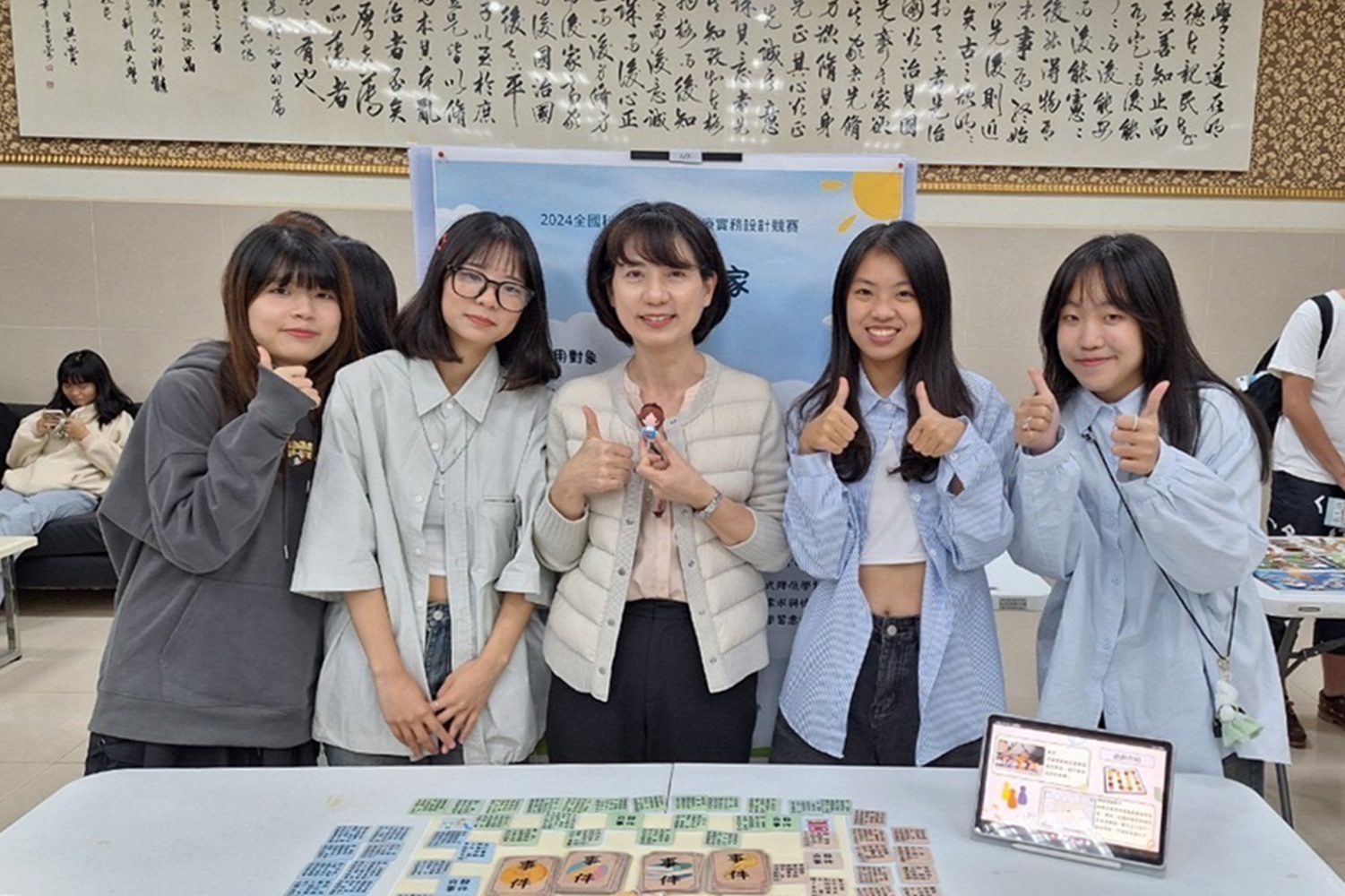 獲得銀牌獎的「小『話』家」兒童教材,由系主任鄭湘君指導簡织紜、何嘉綺、劉恩慈、丁鈺樺等4位同學設計製作。組長簡织紜說,這次實務競賽讓從零開始自行發想設計,經過不斷的討論、調整做出「小『話』家」情境式大富翁教材,希望能讓兒童透過大富翁遊戲學習開口表達自己的想法,比賽當天評審老師給予的調整方向建議,讓他們更清楚的知道孩子們的需求,可以修改作為日後實習或職場實際應用的教材。