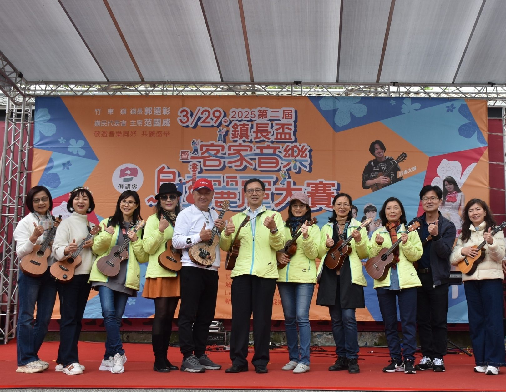 新竹縣竹東鎮公所3月29日下午在Wah!幾散竹東園區舉辦的2025年第二屆鎮長盃暨客家音樂烏克麗麗大賽,吸引不少烏克麗麗的愛好者參加,鎮長郭遠彰也帶著他所指導的鎮公所烏克麗麗班來參賽,和鄉親一起同樂。