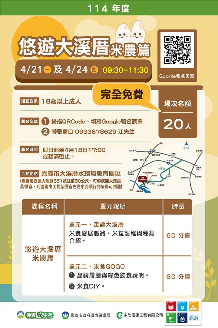 課程第一單元分享台灣米食耕作變遷歷程與米種特色介紹,藉此了解台灣米食文化發展脈絡;第二單元透過米食相關DIY手作體驗,加深對米食的認識,同時激發創意,感受製作過程的成就感。大溪厝水環境教育園區後續將持續辦理相關課程活動,並推出一系列主題活動,可關注嘉義市政府環境保護局Facebook粉絲專頁,活動免費,名額有限,歡迎掃描QR-Code連結Google表單報名參加。