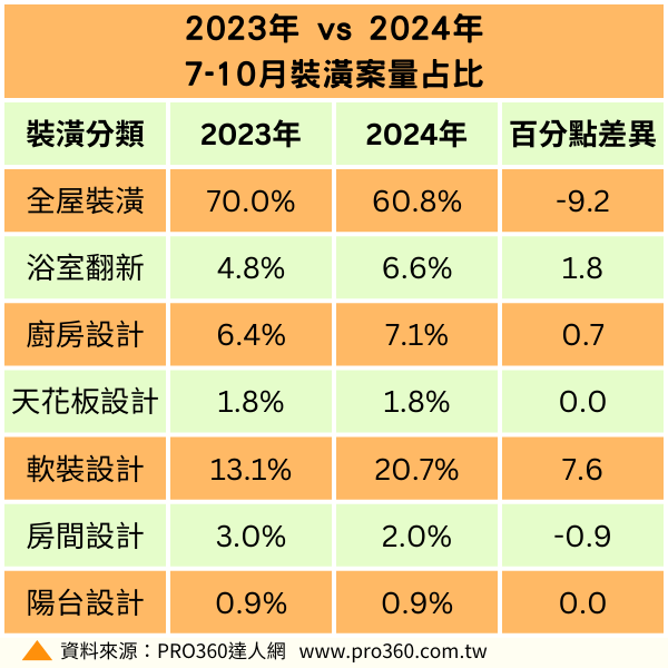 因為打房政策,房市從第三季開始降溫,不過裝潢需求卻不減反增!接案平台PRO360達人網統計平台裝潢案量,今年7-10月裝潢相關案件較去年同期增6%,在今年設計案量中「全屋裝潢」仍為最大宗,達60.8%,其次「浴室翻新」20.7%,也有7.1%的人單純做「廚房整修」。進一步觀察案量占比變化,「全屋裝修」占比減少9.2%,而「浴室翻新」,增加了7.6%,凸顯以局部裝修取代全屋裝修的比例有增加的狀況。