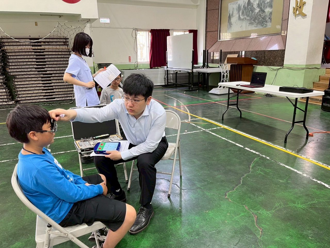 「來,左眼遮住看這裡」驗光師在學校禮堂建置簡便驗光室,為每一個自稱看不太清楚的小朋友驗光,檢查了30多人,其中10名孩子確定是近視,必須配載眼鏡,又有3人伴隨有散光。