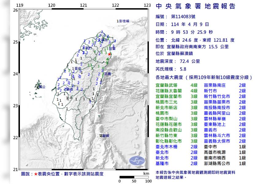 宜蘭縣地區最大震度 4級